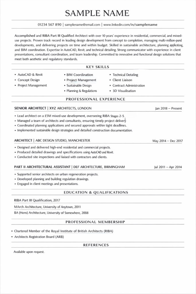 Education and professional membership are also essential. Include your degree, university, and any distinctions. If you are registered with the Architects Registration Board or a member of RIBA, this should be clearly stated. For Part 2 or Part 3 candidates, make your status transparent. Employers appreciate honesty and clarity regarding qualification level.