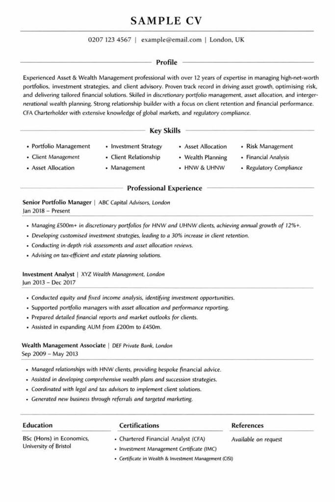 Education should be concise and relevant. Degree details, professional certifications and specialist training are sufficient. There’s no need to include outdated or unrelated qualifications if you’re an experienced professional. Remember, a senior asset or wealth management CV is about focus, confidence and authority.