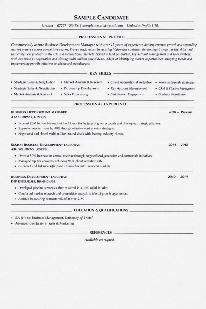 Your Business Development CV should ideally be two pages in length for mid to senior level professionals in the UK. Use clear headings, consistent formatting and ample white space. Avoid unnecessary jargon and focus on clarity and commercial impact.