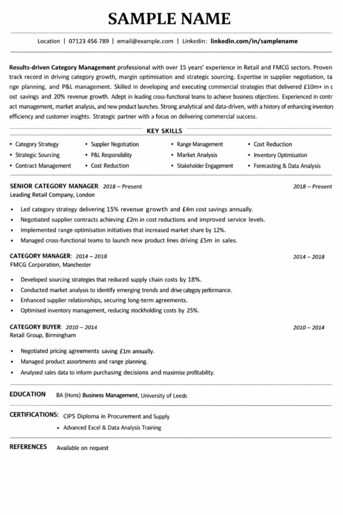Aim for clarity and impact. Two pages is ideal for most Category Management professionals in the UK. Use clear headings and consistent formatting. Avoid dense paragraphs. Every line should earn its place.
