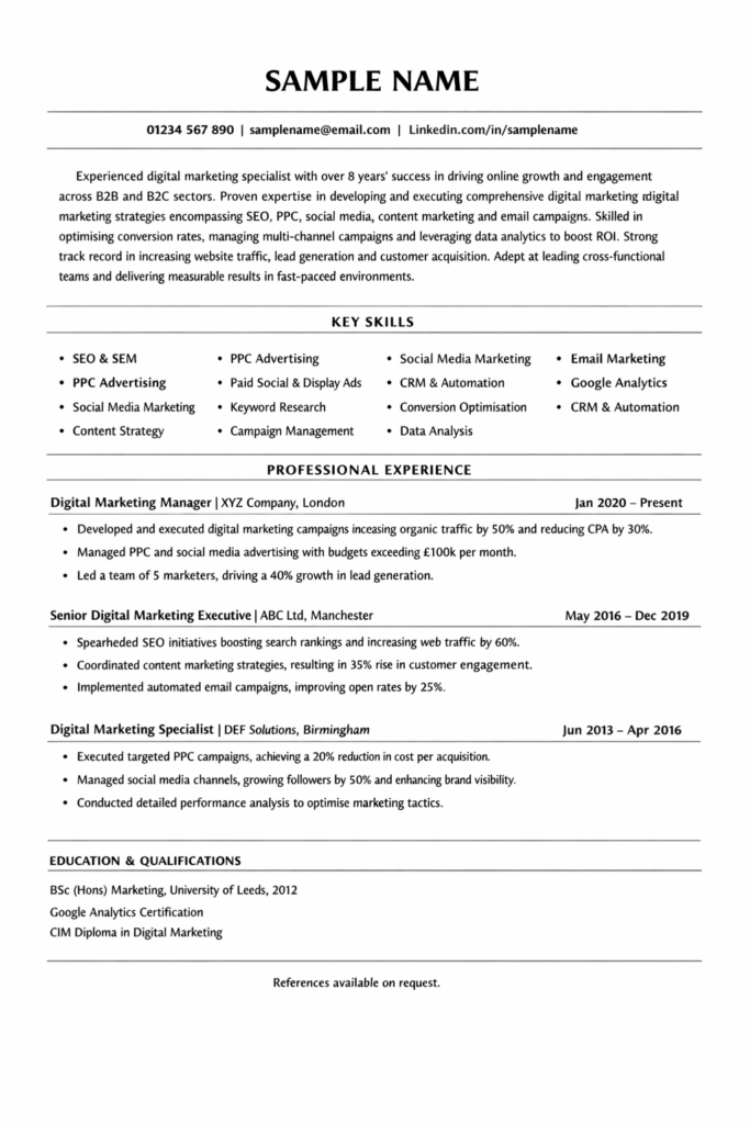 Education and professional development remain important in digital marketing. Include relevant degrees, CIM qualifications or certifications such as Google Analytics certification or Google Ads certification. Continuous learning is highly regarded in this sector. If you have completed courses in data analytics, content strategy or social media advertising, list them. It signals curiosity and commitment to staying current in a rapidly evolving industry.