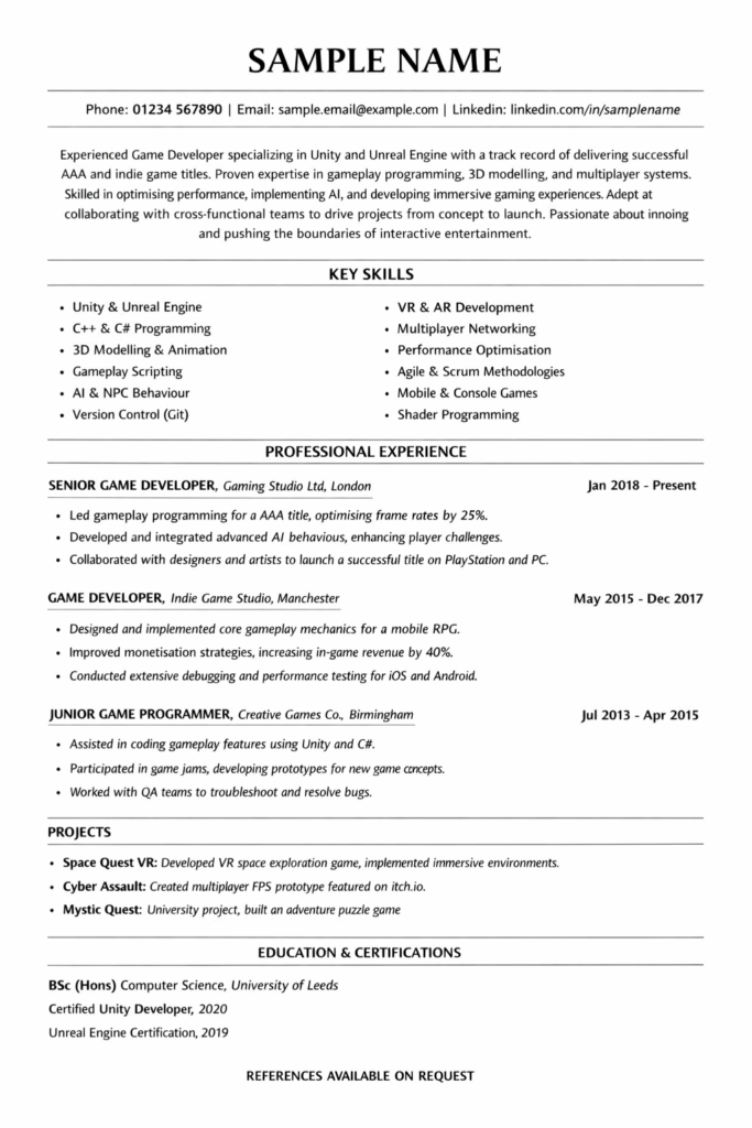 For example, you might describe yourself as an experienced game developer with commercial experience in Unity and Unreal Engine, specialising in gameplay systems and performance optimisation. This immediately positions you within the game development sector and improves visibility if your CV is searched in an applicant tracking system.