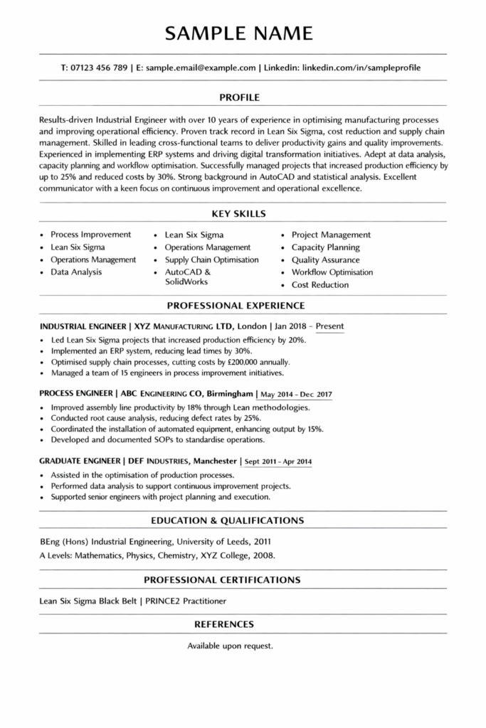 Your Industrial Engineering CV should open with a concise professional profile of four to six lines. This is your executive summary and it must immediately communicate your value. Use phrases such as Industrial Engineer with expertise in process improvement, Lean Six Sigma, operations management and cost reduction. Mention your years of experience, sector exposure such as manufacturing or supply chain, and the scale of projects you have delivered.