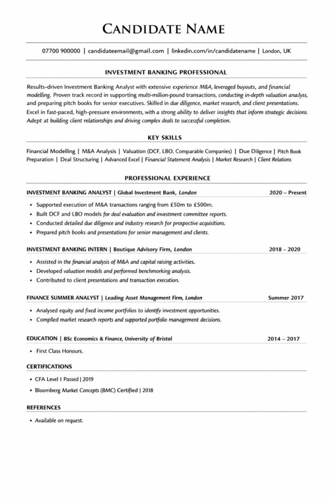 Your investment banker CV should open with a short professional profile of no more than four lines. This is your positioning statement. State your current role or target role, years of experience, sector focus and core strengths such as M&A, leveraged finance, ECM, DCM, valuation or financial modelling.