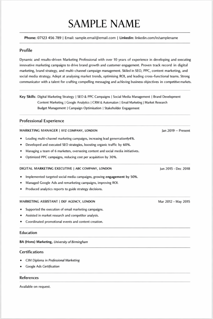 If you are applying for roles such as Marketing Manager, Digital Marketing Executive, Brand Manager, or Head of Marketing, tailor your CV to reflect leadership, strategy development, budget management, and cross functional collaboration. Employers want to see commercial awareness and the ability to align marketing strategy with business objectives.