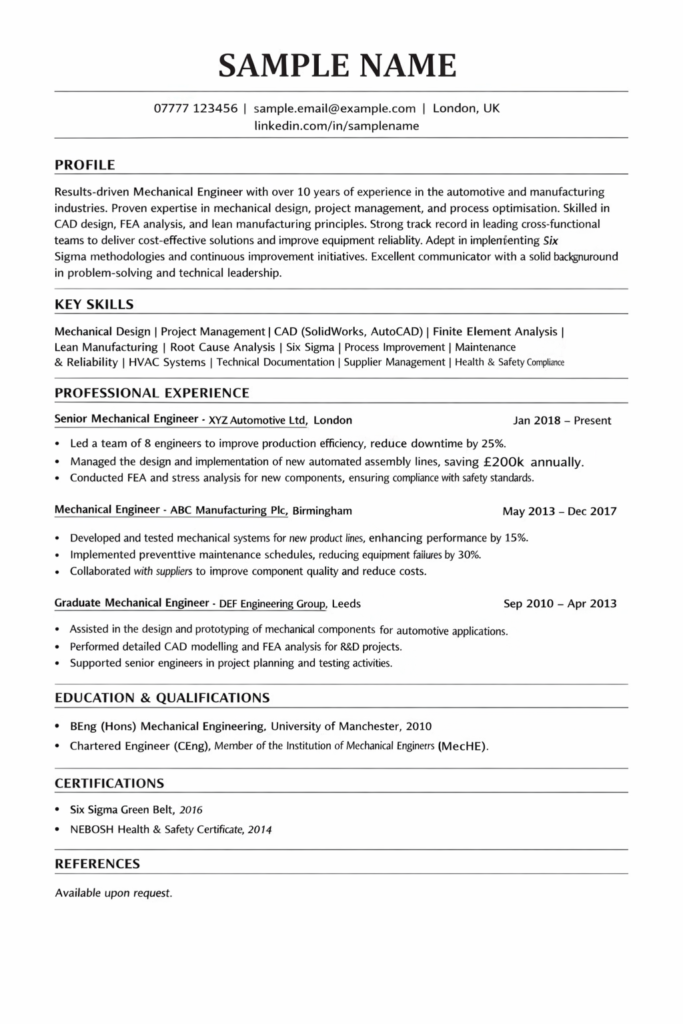 Include your degree such as BEng Mechanical Engineering or MEng Mechanical Engineering. Mention the university and year of graduation. If you achieved honours, include this. Professional accreditation is highly valuable in the UK. If you are a Chartered Engineer or working towards CEng status with a recognised body, highlight this clearly.
