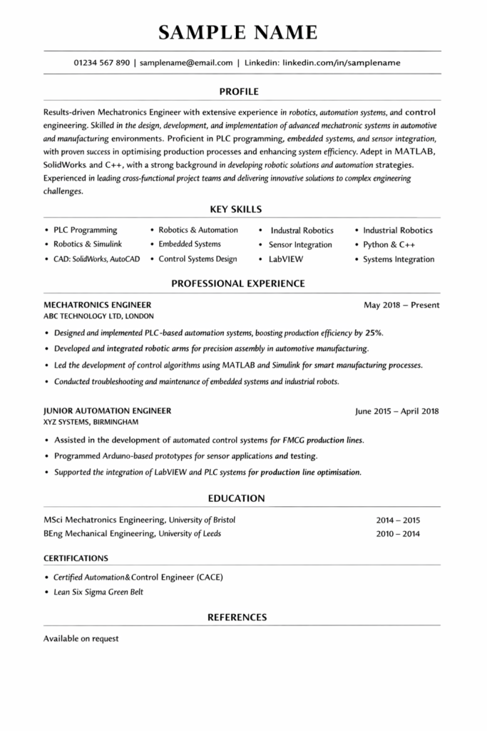 Your professional profile should sit at the top of your CV and immediately position you as a credible Mechatronics Engineer. In three to five concise sentences, summarise your experience, core competencies and career focus. Use relevant SEO keywords naturally within this section such as Mechatronics Engineer, robotics engineering, automation systems, PLC programming, embedded systems, control systems design and CAD modelling.