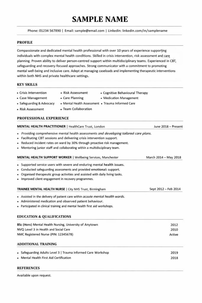 Your professional profile is prime real estate. In three to five lines, summarise your experience, clinical specialisms and core strengths. Whether you are writing a mental health nurse CV, a mental health support worker CV or applying for a senior practitioner role, this opening paragraph must immediately communicate your value.
