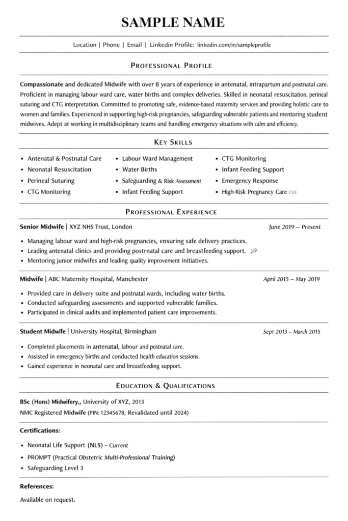If you are applying for an NHS midwife CV role, also reference adherence to NHS values and evidence based maternity services practice. Trusts are looking for midwives who align with patient centred care and continuous improvement.