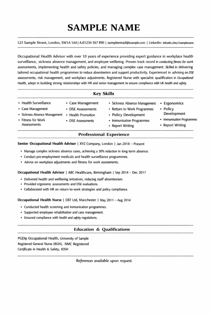 Your professional profile sits at the top of your CV and should immediately capture attention. This short paragraph must include core Occupational Health keywords such as health surveillance, case management, sickness absence management, fitness for work assessments, workplace risk assessment, clinical governance and health and safety compliance.