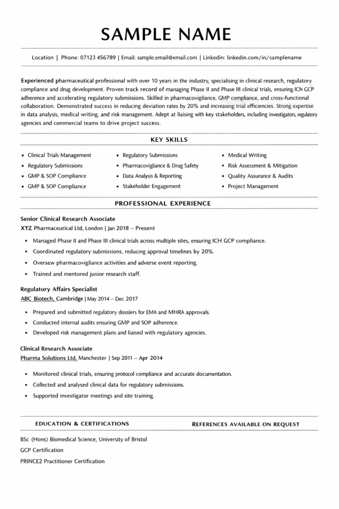 For example, if you are a Clinical Research Associate, highlight your experience in monitoring clinical trials, ensuring ICH GCP compliance and liaising with principal investigators. If you work in pharmaceutical sales, reference territory management, key account management and revenue growth. This opening section should immediately reassure employers that you understand the pharmaceutical sector and its regulatory environment.