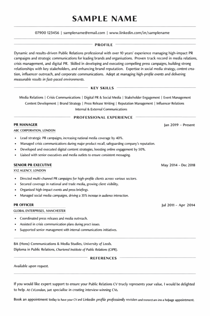 Modern Public Relations roles require both traditional and digital capability. Your CV should reflect experience in media relations, press releases, journalist liaison, broadcast interviews, thought leadership campaigns and corporate communications.