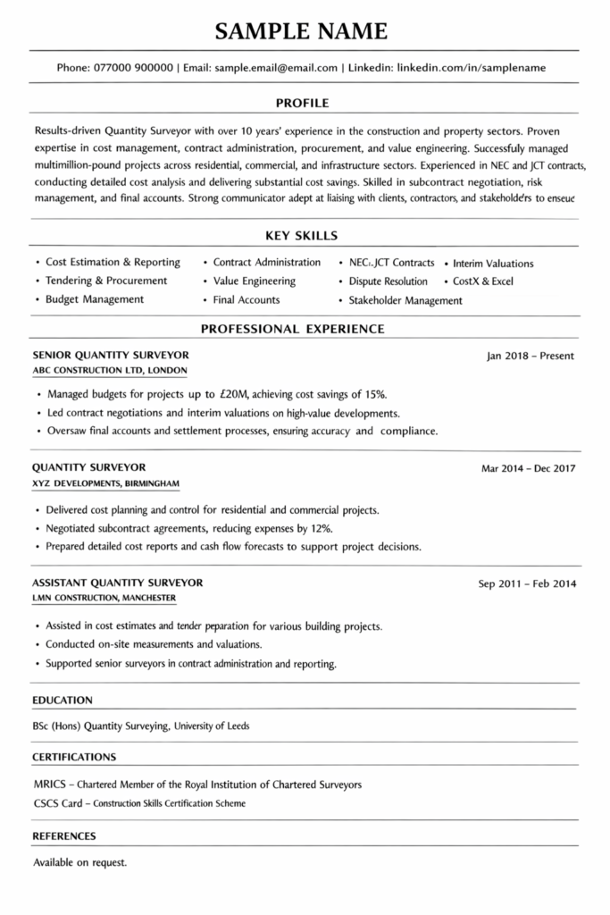 The UK construction industry places high value on professional accreditation. If you are a member of the Royal Institution of Chartered Surveyors, clearly state your MRICS or FRICS status. Include your degree in Quantity Surveying, Construction Management or a related discipline, along with any relevant certifications.