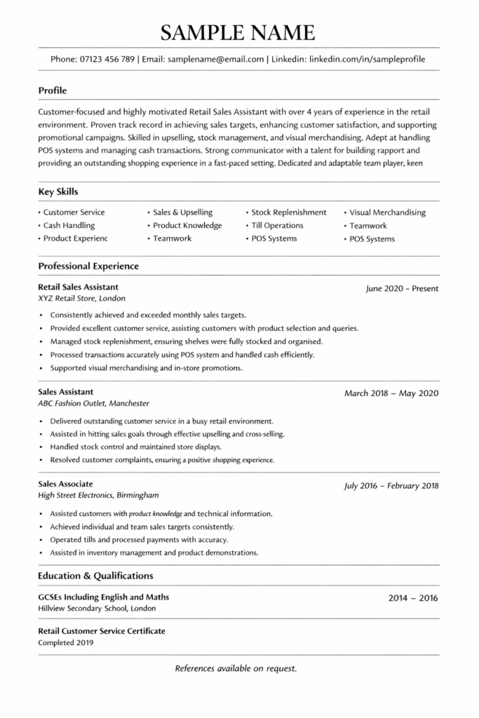 Your education section does not need to be lengthy, but it should be clear. Include your GCSEs, A Levels or equivalent qualifications. If you have completed retail training, customer service courses or health and safety training, add these. Continuous development demonstrates initiative and professionalism.