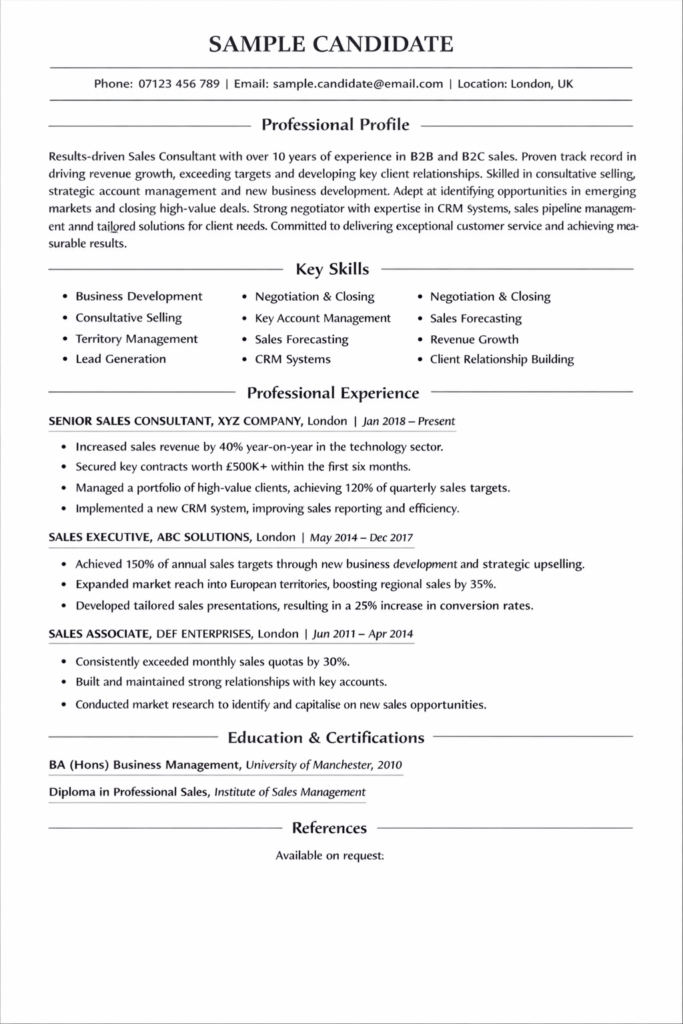 For example, you might describe yourself as a results driven Sales Executive with a proven track record of exceeding sales targets, expanding market share and building long term client relationships across competitive UK markets. This immediately signals commercial value.