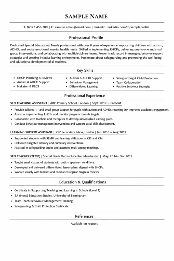Your professional profile is your first impression. In three to five concise lines, clearly state your job title, years of experience and core areas of expertise. Use relevant keywords such as Special Educational Needs, SEN support, EHCP, autism spectrum condition, ADHD, speech and language needs, safeguarding, behaviour management and inclusive education. Schools and education recruiters often use applicant tracking systems, so including these keywords naturally within your CV is essential.