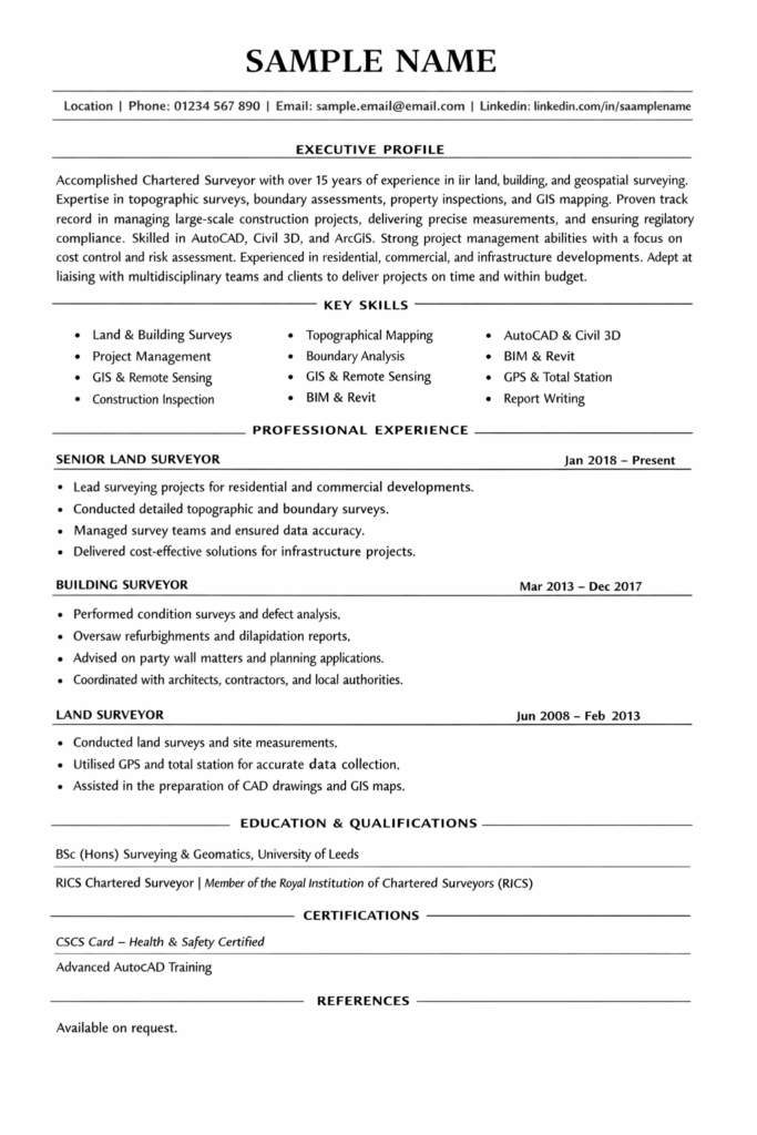 For example, you may highlight experience in boundary surveys, measured building surveys, site engineering, construction cost management or geospatial data analysis. Mention chartered status if you are a member of RICS or CIOB. Recruiters in the UK property and construction market actively search for keywords such as RICS Chartered Surveyor, GIS mapping, topographical surveys, project management and cost control.